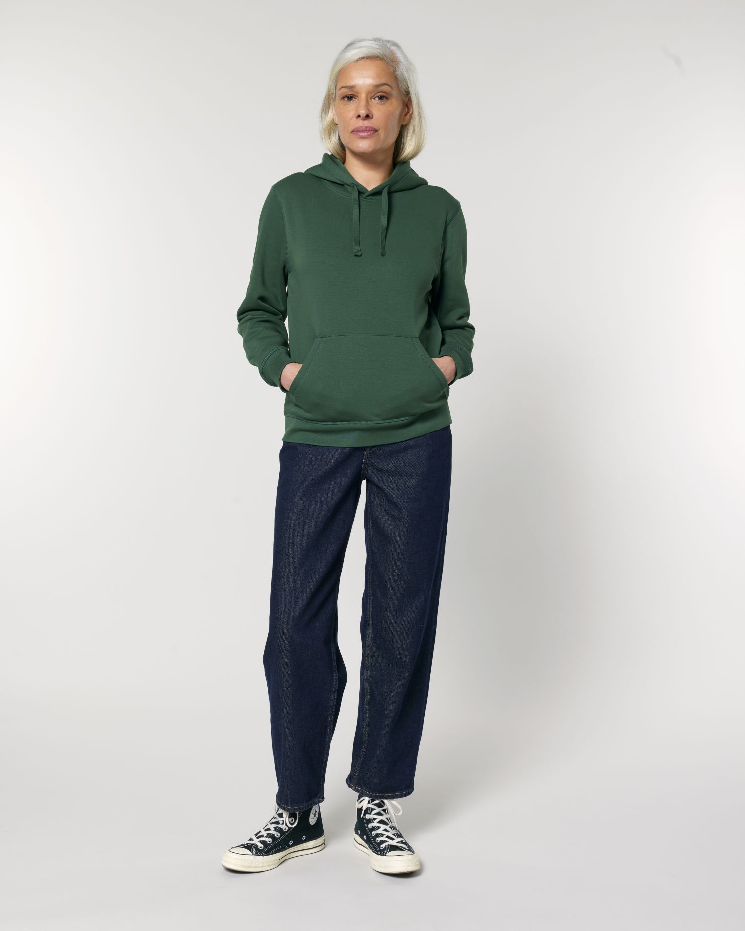 - Bolsillo canguro con pespunte de doble aguja